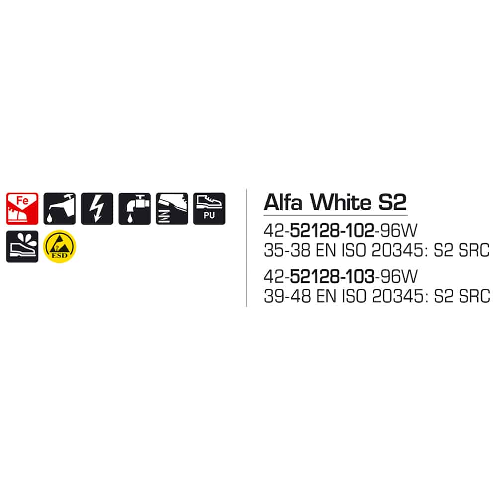 Sievi Alfa White S2 – valkoiset ESD hyväksytyt antistaattiset turvakengät. Soveltuu hyvin esimerkiksi sairaalajalkineeksi. Kengissä on liukuestopohja ja kengän pinta on toistuvaa pesua kestävää mikrokuitua. Helppo pitää puhtaana. Soveltuu turva- ja työkengäksi. CE ja ESD hyväksytty.