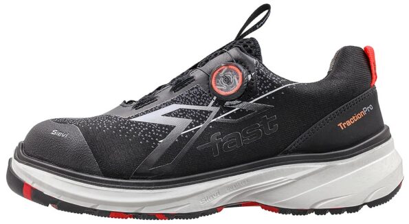 Kengän ShieldKnit®-päällinen on erittäin hengittävä ja kestävä tekninen materiaali, ja Sievin mukaan neulos sisältää 60 % kierrätysmateriaaleja. FastX-sarjan ominaisuuksiin kuuluvat myös hyvä vaimennus, pitävä pohjarakenne ja turvalenkkarimainen käyttötuntuma, mikä tekee mallista houkuttelevan valinnan aktiiviseen työhön.