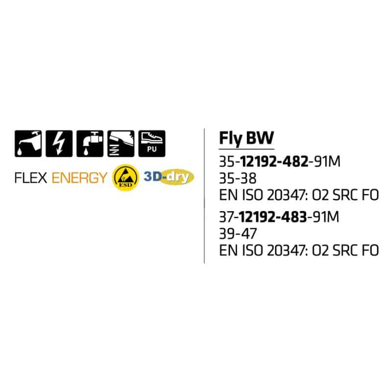 Sievi Fly on Sievi kenkien monipuolisuuden taidonnäyte, sillä nämä jalkineet soveltuvat moniin eri työtehtäviin, mutta myös vapaa-aikaan. Tämän tyylikkään, tennarityylisen kävely- ja työkengän päällinen on hengittävää tekstiiliä, joka tuntuu mukavalta jalkaa vasten. 3D-dry-vuoren sekä Sievi Comfort -pohjallisten ansiosta jalkasi pysyvät kuivina ja saavat hengittää tehokkaasti. Sievin kehittämä 3D-dry-vuori siirtää kosteutta tehokkaasti jalan pinnalta pois vuorimateriaalin ja päällisrakenteen kautta pois kengästä. Sievin kehittämä FlexStep®-pohjamateriaali takaa sekä pohjan pidon että kenkien mukavuuden – joustopohjan rakenne ehkäisee tehokkaasti jalkoihin ja selkärankaan kohdistuvaa rasitusta ja vaimentaa iskuja. Flexstep® kiilapohja kestää myös öljyä ja useita kemikaaleja, joten kengät soveltuvat monille aloille työkäyttöön.