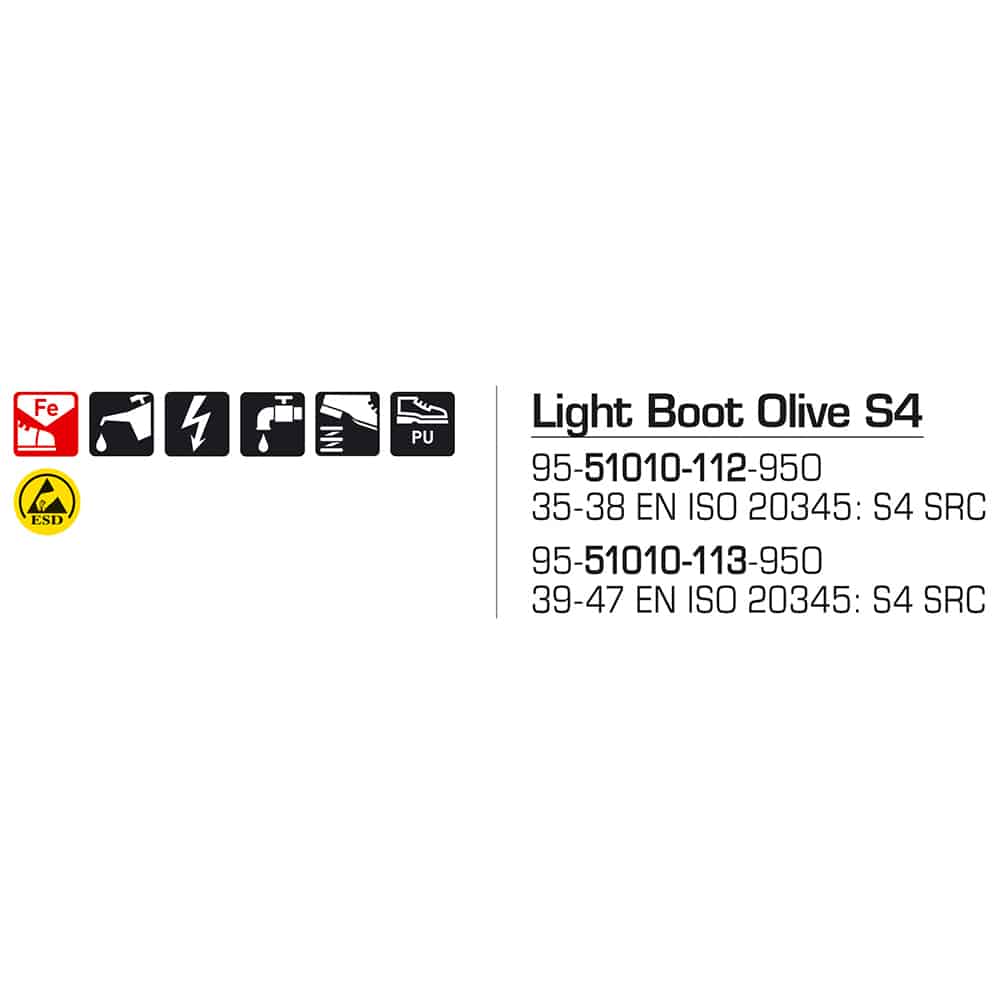 Sievi Kevytsaapas Light Boot Olive S4 on saumaton ja poikkeuksellisen kevyt turvakumisaapas märkiin ja likaiseen työympäristöön. Polyuretaanin mikrosolurakenne tekee saappaasta mukavan käyttää ja kestävän, ja FlexStep®-joustopohja vaimentaa askelta vähentäen rasitusta jaloille. Teräksinen turvakärki suojaa varpaita, ja pohja kestää öljyä sekä useita kemikaaleja. Lisäksi saapas on antistaattinen ja ESD-hyväksytty, joten se sopii moniin työympäristöihin, joissa hallittu sähkönpurkaus on etu.