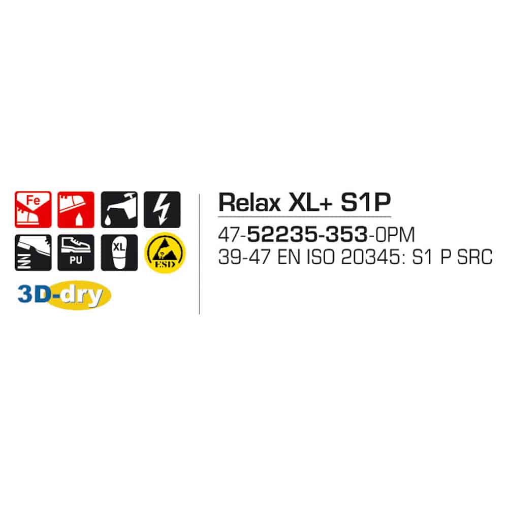 Sievi Relax XL S1P – kestävät turvajalkineet. Soveltuu erinomaisesti sisäkäyttöön, mutta sään suosiessa kestää myös ulkokäyttöäkin. Jalkine on varustettu teräskärjilläja naulaanastumissuojalla. Kulutusta kestävä ESD hyväksytty turvaluokan S1 P SRC turvaluokan jalkine.