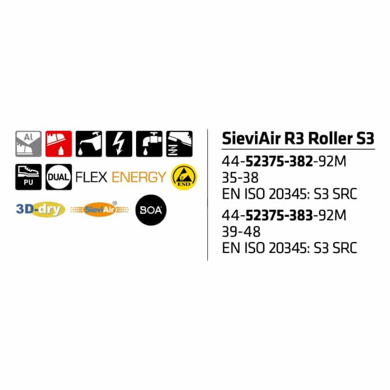Kenkä on valmistettu kestävästä ja vettä hylkivästä mikrokuidusta, ja suojaus on tehty vaativaan käyttöön: alumiininen turvakärki sekä teräksinen naulanastumissuoja tuovat luotettavaa turvaa vaihtelevissa olosuhteissa. Jalat pysyvät kuivempina ja raikkaampina 3D-dry-vuoren sekä Sievin patentoidun SieviAir®-pohjaratkaisun ansiosta. SieviAir® toimii ikään kuin suodattavana “pumppuna”: jokaisella askeleella järjestelmä ohjaa lämpimän kosteuden ulos pohjan uloshengityskanavien kautta.
