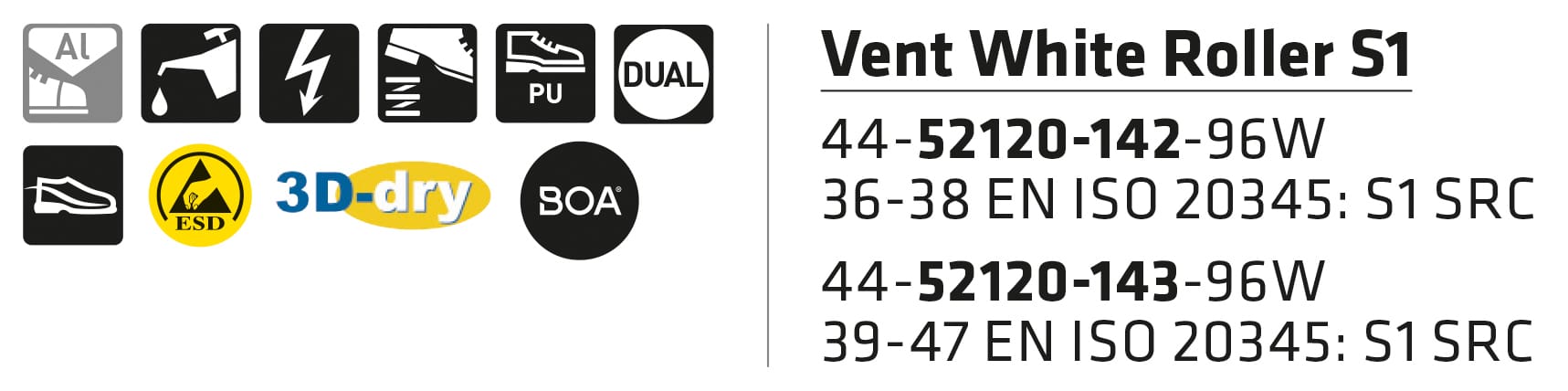 Sievi Vent White Roller S1 turvakenkä BOA® Fit System-kiinnityksellä. Kenkä on valmistettu kestävästä, vettä hylkivästä ja hengittävästä mikrokuidusta. Mikrokuitu kestää myös hyvin usein toistuvaa pesua. FlexStep®-kiilapohja on joustava ja hyvällä pidolla, se kestää myös öljyä ja useita kemikaaleja. Sievi Vent White Roller sopii erityisesti korkeaa hygieniatasoa vaativiin olosuhteisiin. Kengissä on alumiininen varvassuoja, ja dual-pohjallinen lisää mukavuutta.