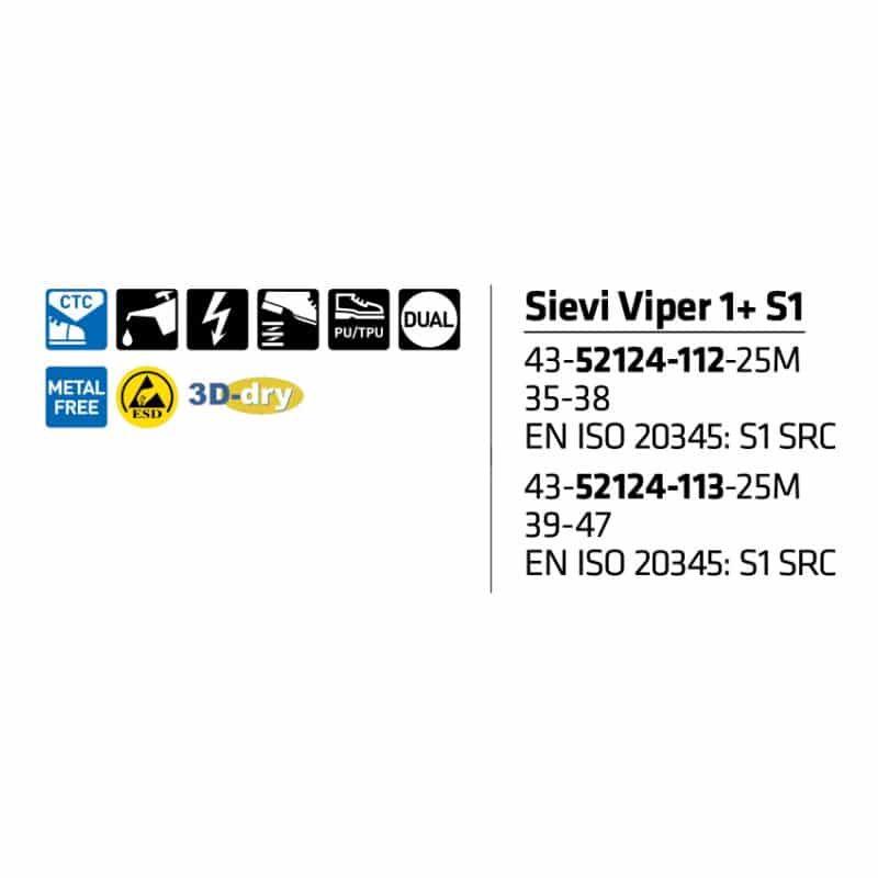 Sievi Viper 1+ S1 turvakengät kevyellä komposiittivarvassuojalla. Dynaaminen Sievi Viper on vastaus tinkimättömään tarpeeseen turvallisuudesta ja designista. Lähes saumattoman rakenteensa ansioista virtaviivainen Sievi Viper on erittäin kestävä ja käytössä mukava, varma ammattilaisen valinta.Päällismateriaali on hengittävää ja vettä hylkivää haljasnahkaa. Hengittävyyttä lisää ilmava 3D-dry-vuori. Sievi Viper on varustettu kevyellä komposiittivarvassuojalla. Kaksikerroksisella termoplastisella polyuretaanipohjalla varustettu Sievi Viper antaa parhaan mahdollisen mekaanisen kulutuskestävyyden ja joustourien ansiosta jalkine taipuu optimaalisesti tehden askeleesta rullaavan. Pohja on erinomaisen iskunvaimennuksen takaavaa FlexStep®-materiaalia. Askel nousee keveästi koko työpäivän ajan!
