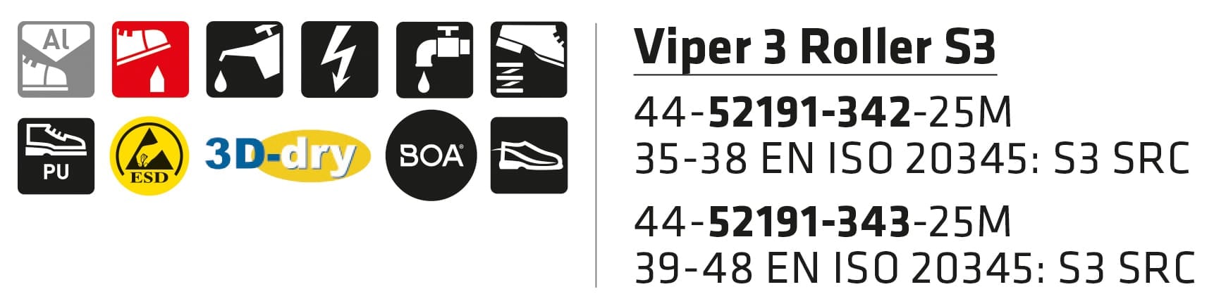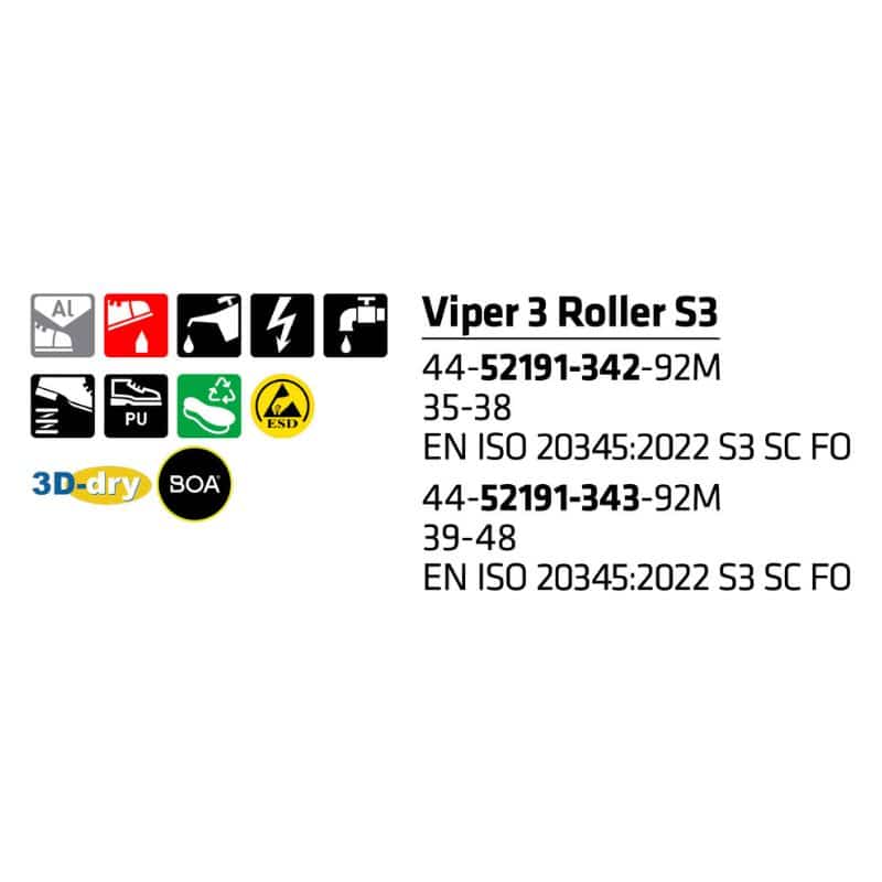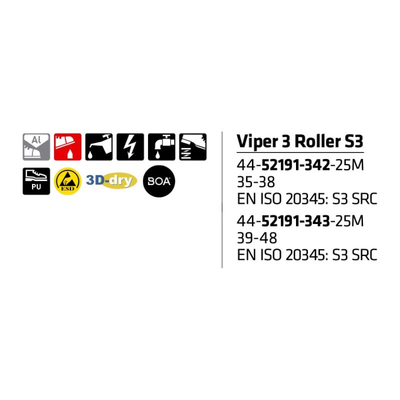 Sievi Viper 3 Roller S3 – sporttiset turvakengät BOA® Fit System -kiinnityksellä. Mukavuutta ja hengittävyyttä lisää ilmava 3D-dry®-vuori. Pidon ja keveyden maksimoi yksikerrospohja, jonka FlexStep®-materiaali takaa myös erinomaisen iskunvaimennuksen.