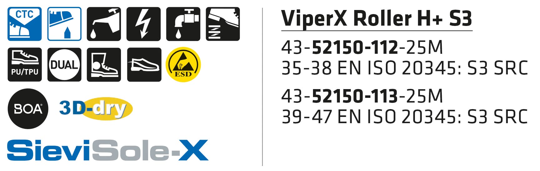 Kenkien hengittävyyttä parantaa Sievin kehittämä 3D-dry-vuori – se siirtää kosteutta tehokkaasti jalan pinnalta pois vuorimateriaalin ja päällisrakenteen kautta pois kengästä, jolloin jalkasi pysyvät kuivana läpi pitkien päivien. Käyttömukavuudesta huolen pitää FlexStep®-pohjamateriaali ja joustopohjan rakenne, joka ehkäisee tehokkaasti jalkoihin ja selkärankaan kohdistuvaa rasitusta ja vaimentaa iskuja. Lisäksi kengissä on Dual-pohjalliset, jotka on varustettu iskunvaimennustyynyillä. Viperx Roller H+ S3 turvakengät on varustettu komposiittivarvassuojalla sekä SieviSole-X komposiittitekstiilinaulasuojalla, joka on kehitetty suojamaan entistä ohuempia nauloja vastaan.