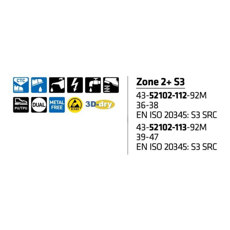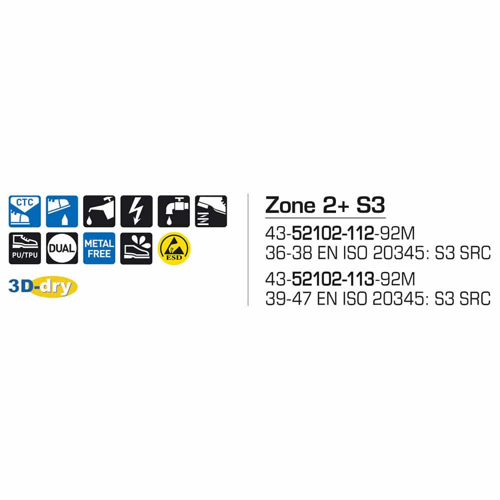 Sievi Zone 2+ S3 – metalliton turvakenkä. Ilmeeltään uudistettu Zone 2+ S3 on metalliton turvakenkä komposiittivarvassuojalla ja -naulaanastumissuojalla. Lisäsuojaa tuo PU-kärkikuppi. Päällinen on kestävää nahkaa ja mikrokuitua. 3D-dry®-vuori siirtää kosteuden pois jalan pinnasta pitäen ne kuivina ja pitävä pohjakuviointi parantaa pohjan kitkaominaisuuksia. Dual-pohjalliset lisäävät käyttömukavuutta.