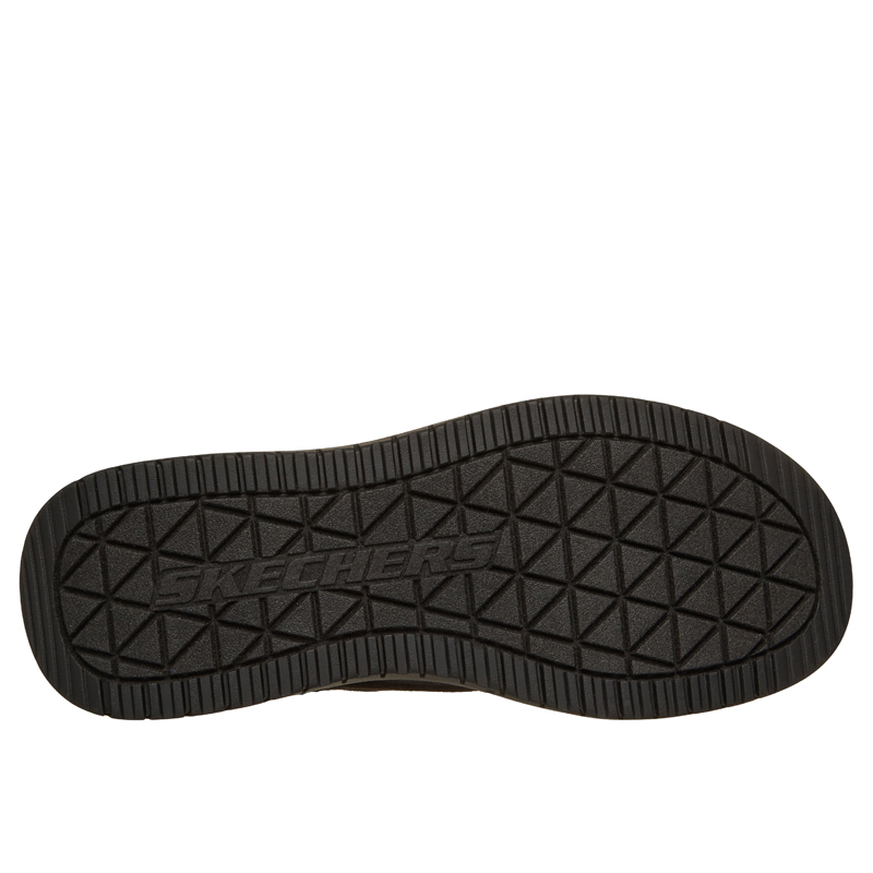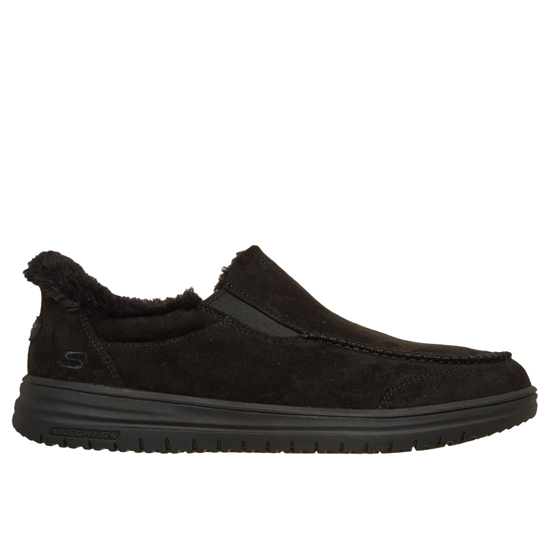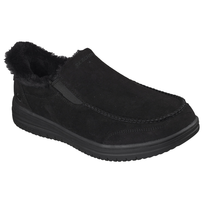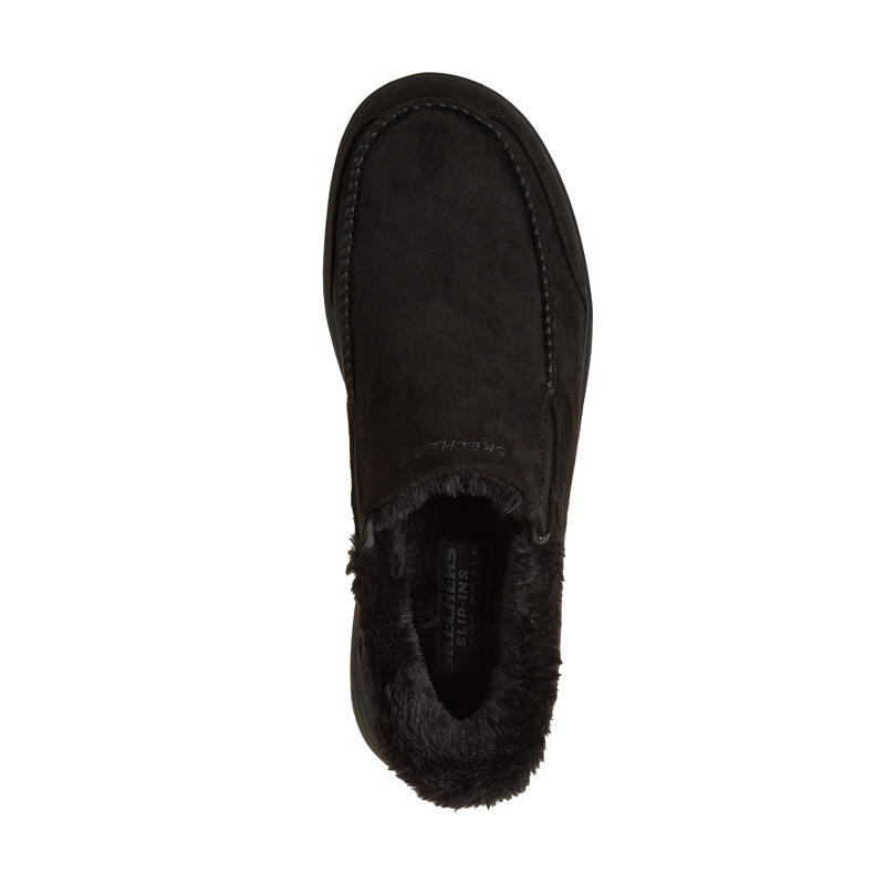 Skechers Hands Free Slip-ins® Relaxed Fit®: Murette – Scofield. Pysy lämpimänä ja mukavana rennossa slip-on-mallissa, joka on helppo pukea ilman kumartelua. Heel Pillow™ -ominaisuus pitää jalan paikoillaan, ja pehmeä mikrokuitupäällinen yhdistettynä mokkatyyliin ja keinoturkisvuoreen tuo lämpöä ja mukavuutta. Luxe Foam® -sisäpohja viimeistelee pehmeän askeltuntuman.