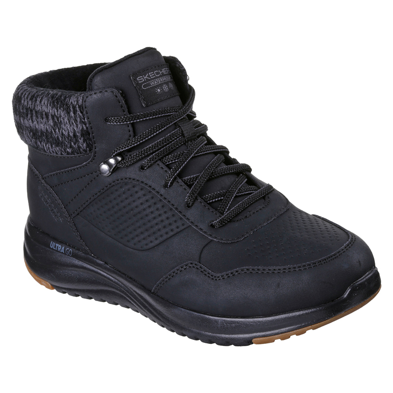 Vegaaninen nahkapäällinen on käsitelty 3M® Scotchgard®-suojalla, joka hylkii vettä ja tahroja. Sisäpohjassa hengittävä Skechers Air-Cooled Goga Mat™ tarjoaa viileää mukavuutta ja energistä askelta, kun taas kevyt ULTRA GO® -vaimennus tekee liikkumisesta pehmeää ja miellyttävää.