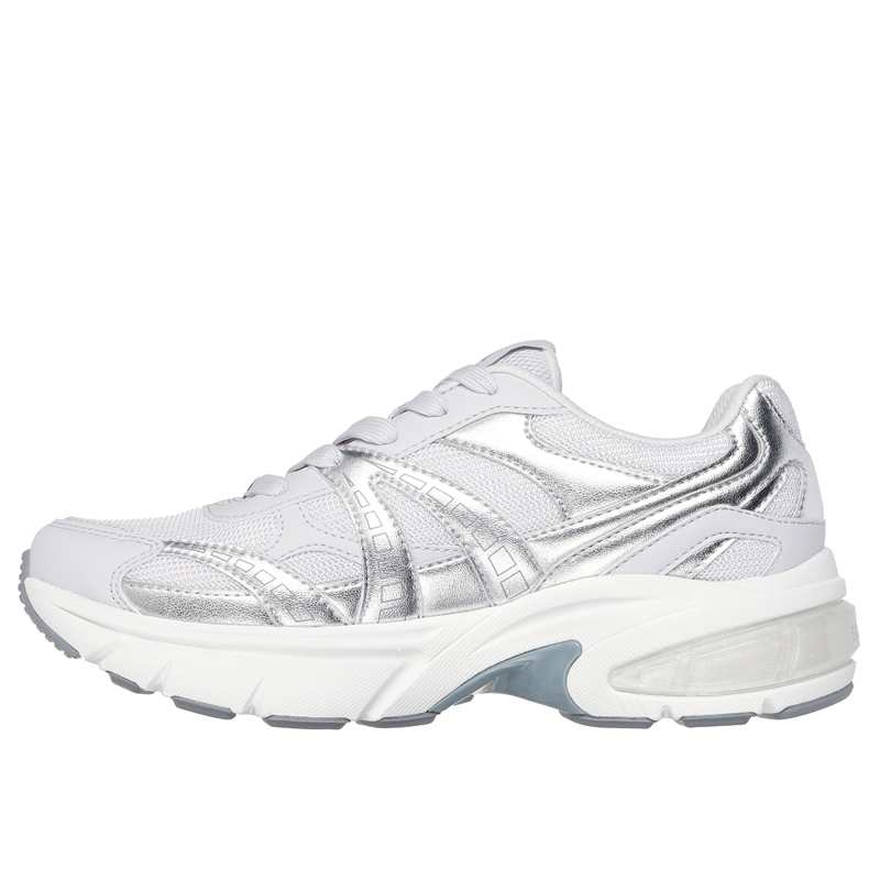 Tutustu Skechers Street Shadow – Stellar 90 -lenkkareihin, jotka hehkuvat urbaania tyylikkyyttä. Nämä nauhalliset tennarit yhdistävät metallinhohtoisen duraleather-päällisen ja verkkokankaan moderniin lookiin, jota täydentää läpinäkyvä välipohjan elementti. Mukavuutta lisää Skechers Air-Cooled Memory Foam-sisäpohjallinen, joka tuo askeleisiisi pehmeyttä jokaisella askeleella.